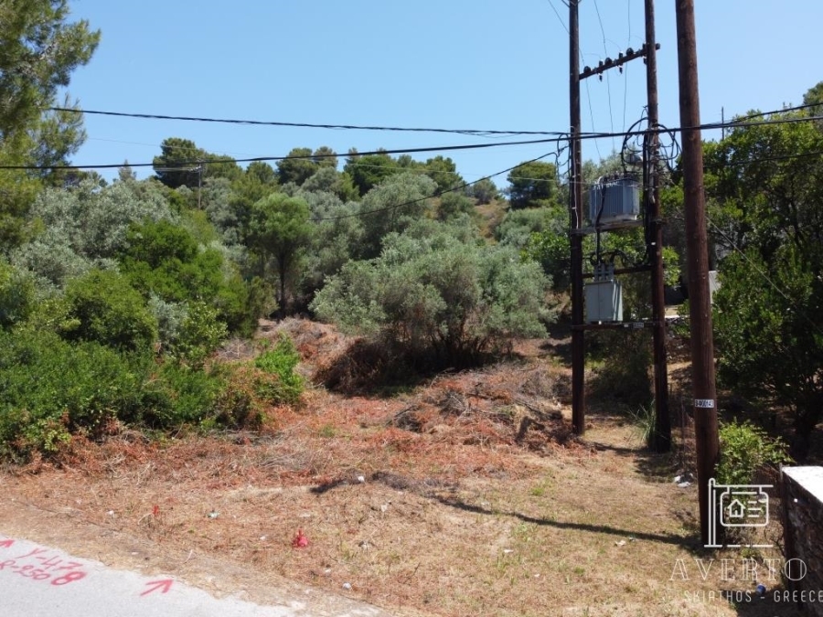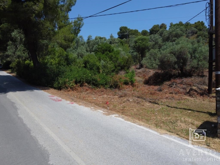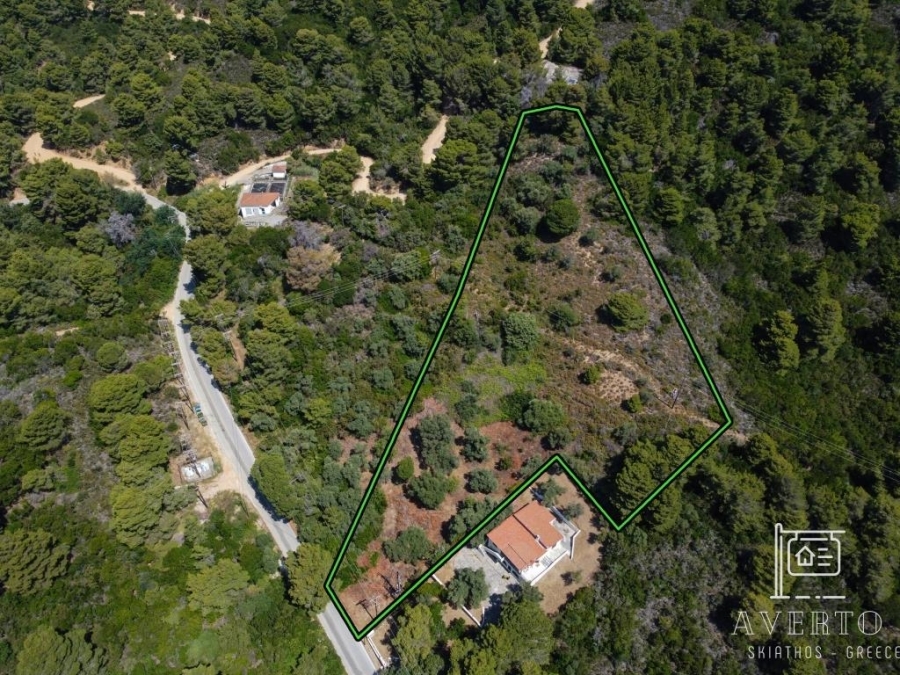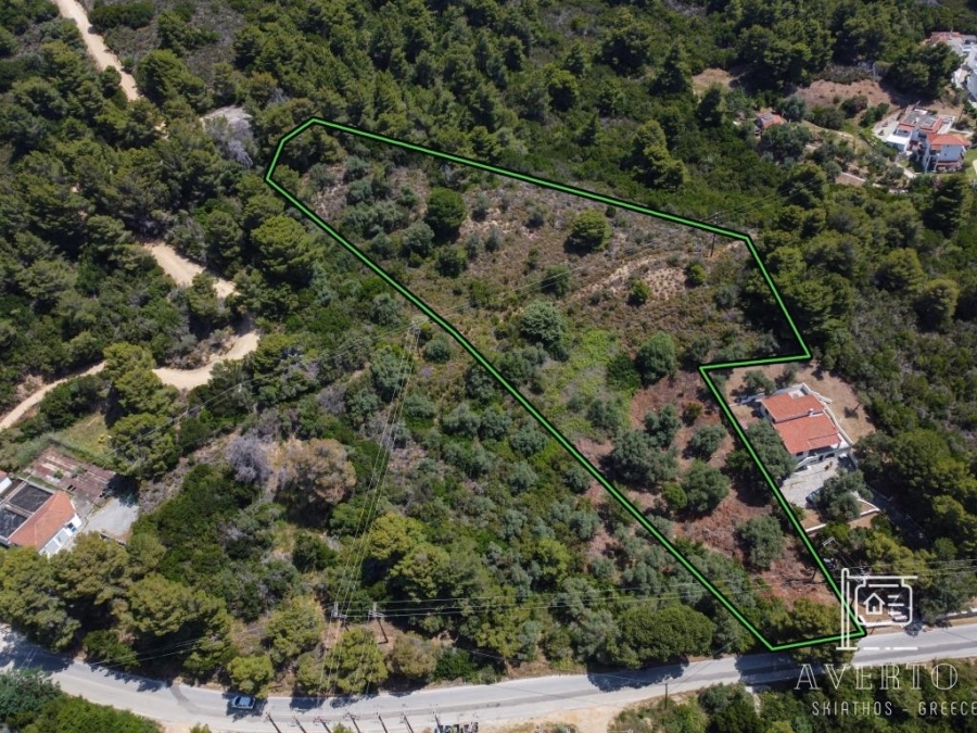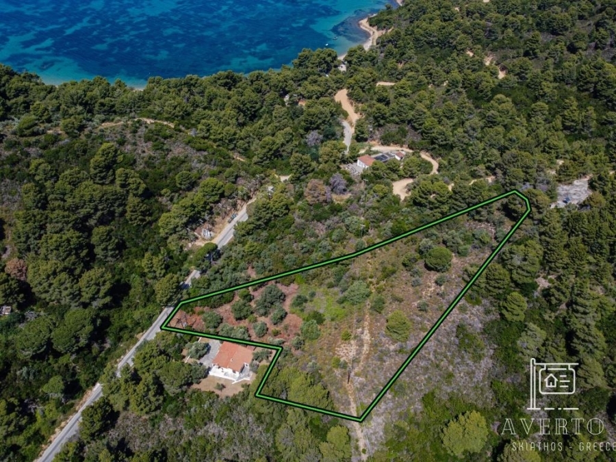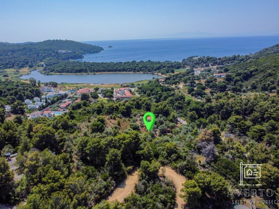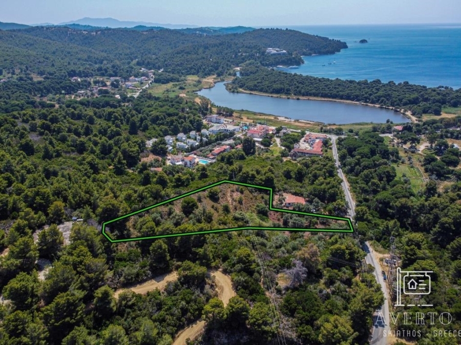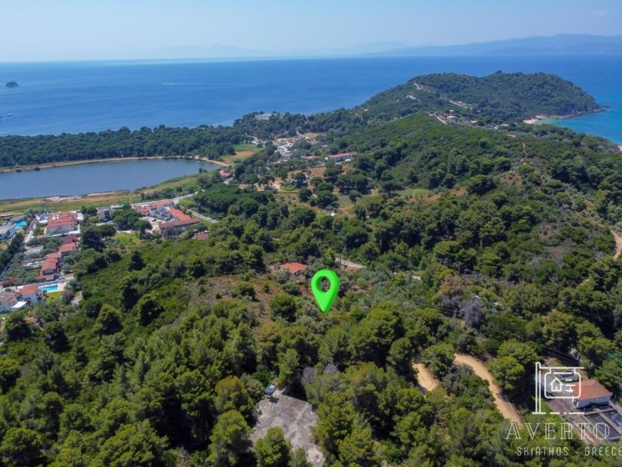Sporades-Skiathos, Agricultural Land For Sale, Out of City plans, 6.964 sq.m., Frontage (m): 11, Depth (m): 168, View: Mountain View + Sea view, Features: For Investment, Amphitheatrical, Sloping, For tourist use, Distance from: Airport (m): 14700, Seaside (m): 240, City (m): 14000, Price: 400.000€. Averto